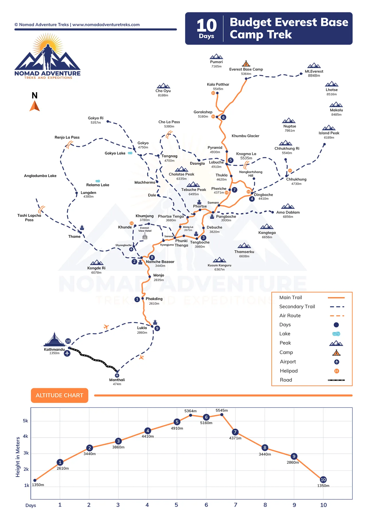Tugann an turas 10 lá ar Everest tú chuig airde ard, dreapadóireacht, dreapadóireacht agus ísliú géar, aimsir neamhchoinníollach, tír-raon garbh, agus siúlóid i gceantair iargúlta. D’fhéadfadh na tosca seo go léir a bheith dúshlánach duit. Chun na constaicí go léir a shárú agus don turas iontach, ní mór duit pleanáil chuí agus bearta sábháilteachta a chur i bhfeidhm.