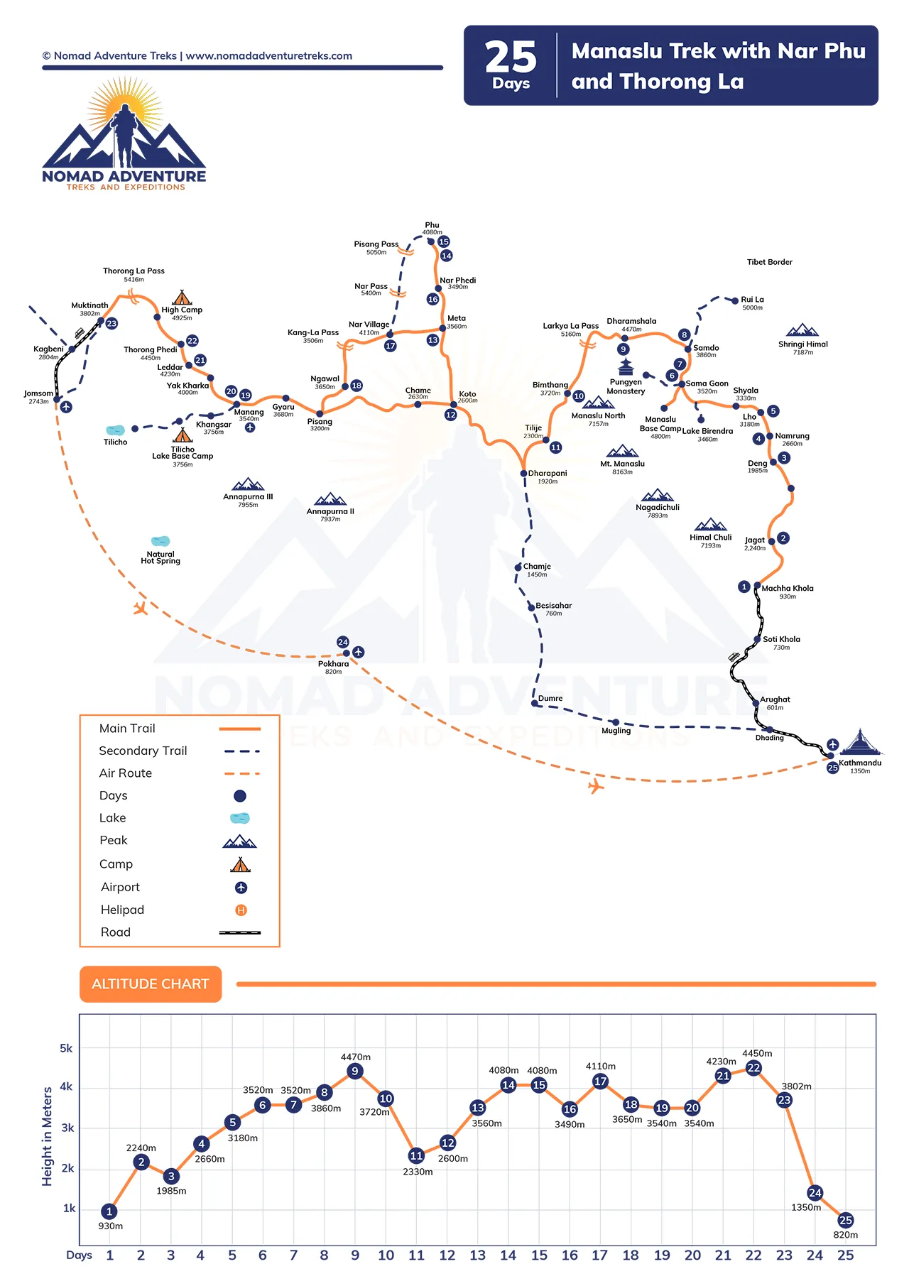 N'ikpeazụ, ị ga-agafe ebe kachasị elu nke Nar Phu na Thorong La njem ụbọchị 25, Kanga La Pass, na mita 5320, ruo Muktinath Temple site na Thorong Phedi (4450 m) ma ọ bụ High Camp (4850 m). N'otu aka ahụ, ị ga-eji ụkwụ gaa ihe dịka kilomita 528 ma ọ bụ kilomita 328 n'ime njem ụbọchị iri abụọ na ise a.