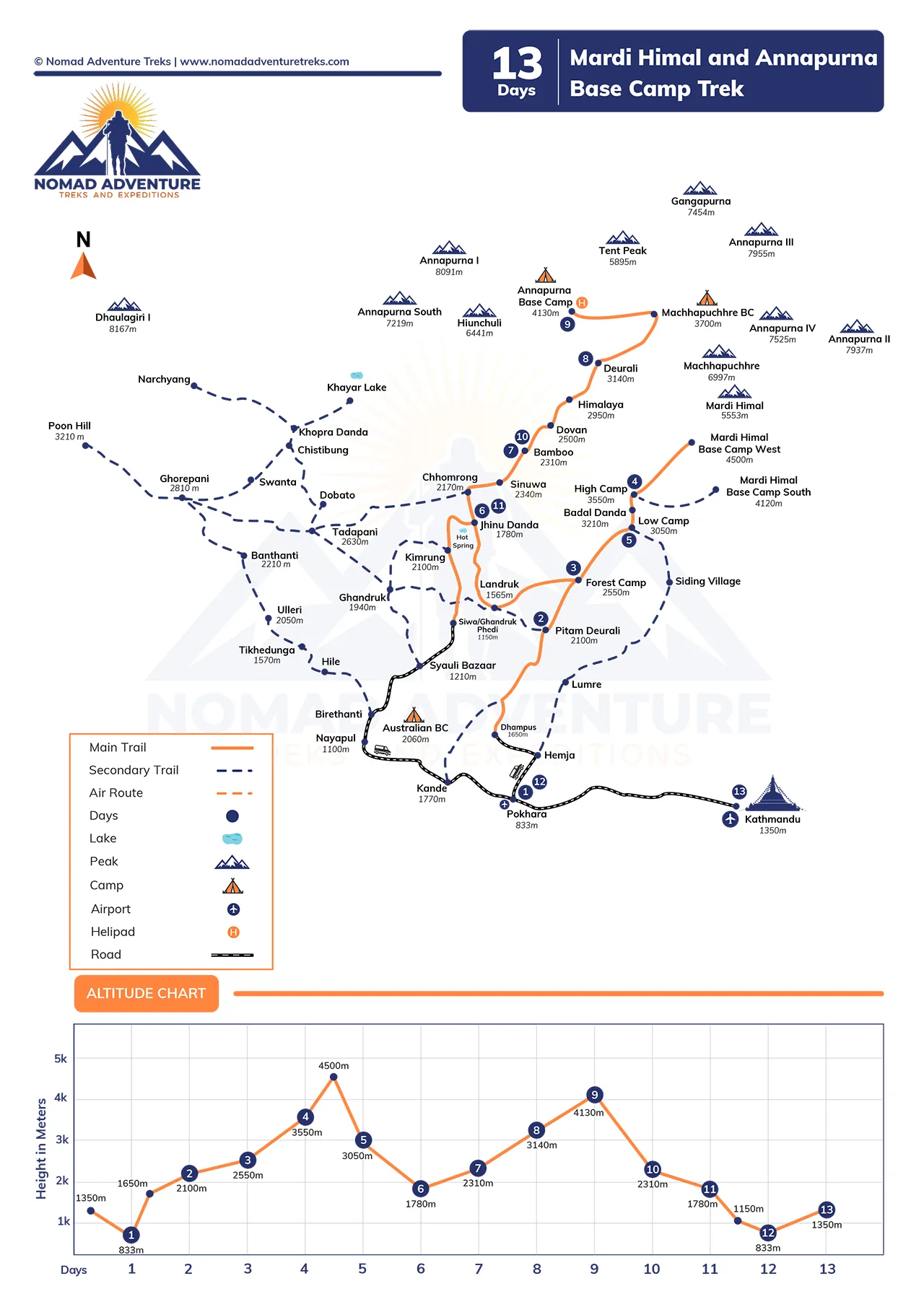 No, acclimatization days are not a part of the Mardi Himal and Annapurna Base Camp Trek-13 days since the itinerary does not take you to a very high altitude (over 5000 meters).But we recommend to take rest day or walk at a slower pace to allow your body to adjust to the altitude.