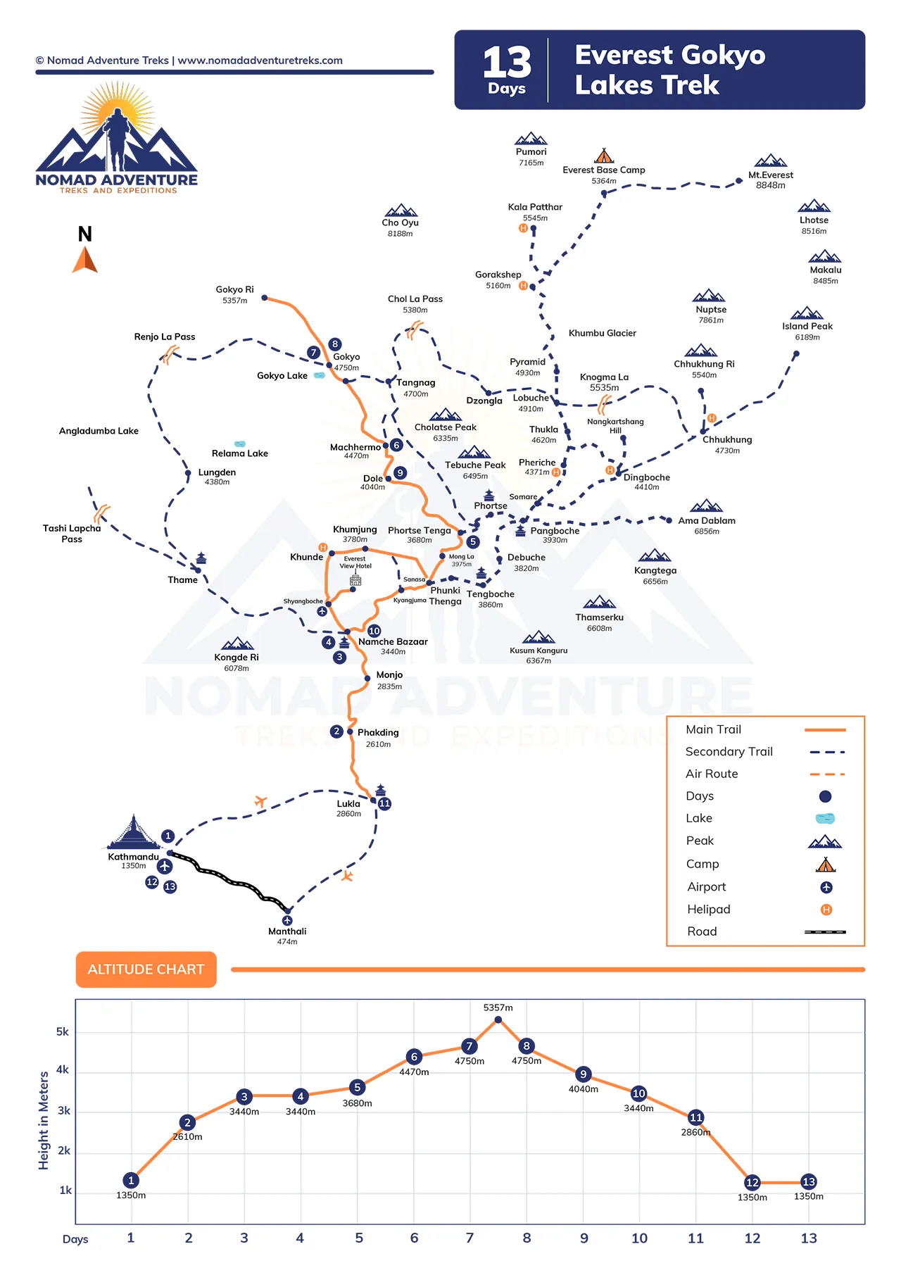 徒步旅行包括完全休息的日子 南奇集市 3,440米处 五桥 在海拔 4,750 米的地方,你的身体 高度可调性。徒步旅行者进行短途徒步到高海拔地区,但在这些日子里却在较低的海拔地区睡觉,以预防高原反应。